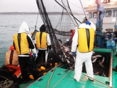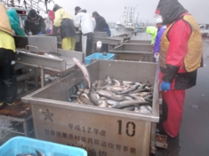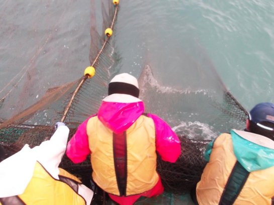 前夜はお酒をひかえめにして、朝3時に港に集合。この日は風が強く、立っているのも大変なほど揺れる船に少々ビビりながら真っ暗な荒波の中を進んで行き、約1時間程で定置網に到着。若者から年配の乗組員総勢13人で力を合わせて網を引いていきます。しばらくすると網の中で元気よく飛び跳ねる魚が見え始め、クレーンを使って船に引き揚げられました。サケマスの他にもホッケやタラ、サバにイカなどが混ざり、ことしは水温が高いせいでブリやマンボウもよく入ったそうです。3カ所の定置網を4時間ほどかけてまわり、最盛期ほどではないものの3,000本ほどの秋サケが獲れ漁は終了。なかなかできないいい経験をさせてもらいました。