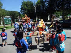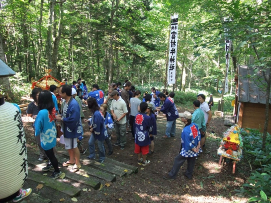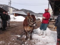 当日の朝は早出して牛の世話を終わらせ、半纏に豆絞りで神社に集合。町内会一同でお参りを済ませ、神主さんのお祓いをうけていよいよ神輿の出発です。子供神輿と大人の神輿、約一時間かけて各家を回り、町内会長が今年一年の幸せを願う口上を述べ交流館に戻り着いた時には、さすがトムラの若者達ももうぐったりです。
