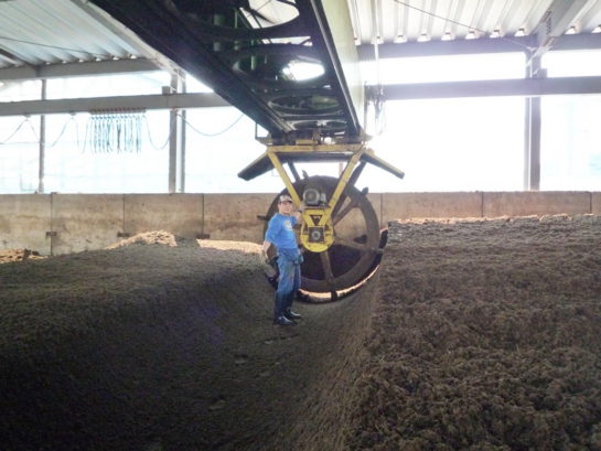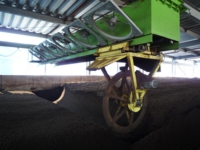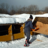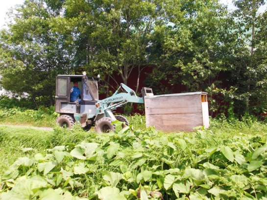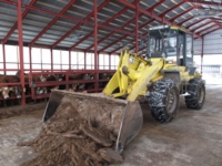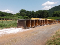 洗い終わったハッチは、またミニショベルで運び、きれいに並べ、最後におがくずを敷いて、仔牛の新居の完成です。毎月250頭分の準備をするので、毎日誰かが携わる大事な仕事です。