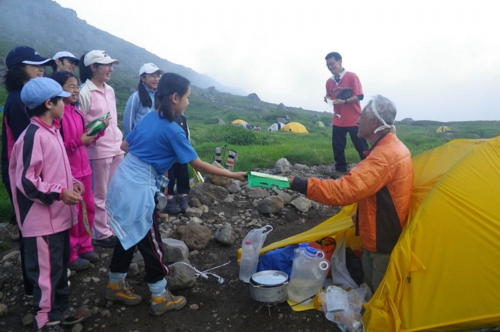グリーンクラブ登山の目的は登ることだけでなく、山での携帯トイレの利用促進キャンペーンと事故で亡くなられた方達の慰霊のための登山です。キャンプ地では、持ってきた花をお供え黙とう。そしてキャンプをしている人達に携帯トイレを配りました。そしてテントを張ってから、いざ頂上へ。険しい岩場をなんとか登りきり、全員無事頂上に立ちました。