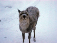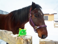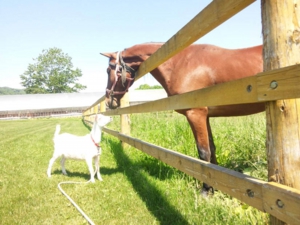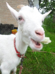 生年月日は不詳ですが、小さくてかわいい声でメーメーと鳴くとまわりの犬や猫、牛や馬も興味しんしんで注目の的です。馬の恵宝とはすぐに仲良しになり、朝山羊舎から出してやると飛んで行って「おはようー ごきげんいかが?」とあいさつしているようです。