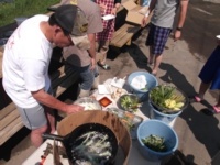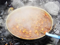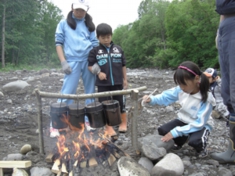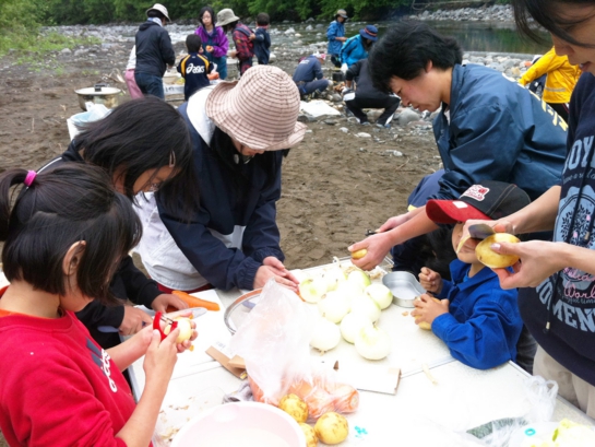 ハイキングのメインは、河原での炊事です。まずは石を積んでかまどを作り、ナタで薪を割り、火を起こします。そして昔ながらの飯盒で飯を炊く。子供達も慣れたもので、上級生は火の係、下級生は調理の下ごしらえと手分けして進んでいきます。一時間程で美味しそうなカレーライスが出来上がりました。最近ではまず食べられない少しおこげのご飯と手作りカレー。みんなが力を合わせて作った料理をきれいな景色を見ながら食べる。最高に美味しかったでーす!