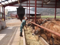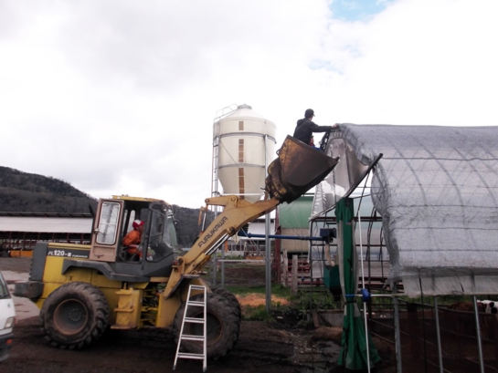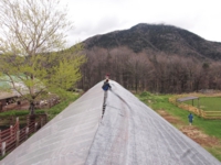 しかし1棟だけあるビニールハウス牛舎は、日差しが強いと温度が上がり過ぎ、牛達にとってはかえってストレスに。そこでこの時期、屋根に黒いネットを張って牛舎内の温度を調節してやります。若者達総出で屋根に上がり、ちょっとビビリながらの作業です。そろりそろりとネットを広げ、金具で留めていきます。2時間ほどできれいに張り上がりました。これで夏も大丈夫。雪が降る前にまたはずします。