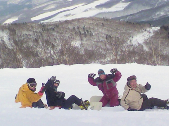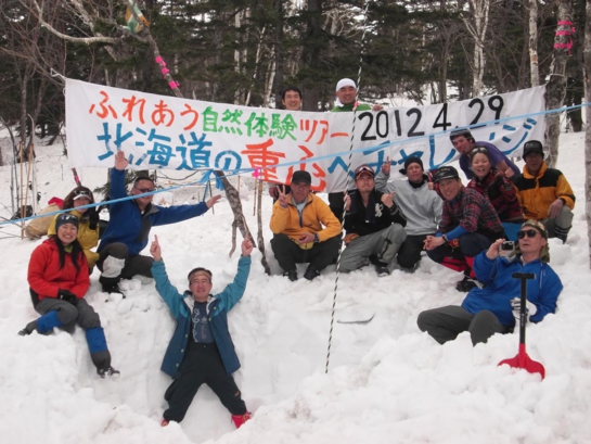関谷牧場からの参加は5人。早起きして餌やりを終わらせ、いい天気の中ルンルン気分で出発です。2時間ほど歩いて最後の急斜面下に到着。そこからはスキーを担いで登ります。やっとの思いで重心に到着したのもつかの間、雪を掘って2mほど下にある重心点を掘りだしました。記念撮影後、ワインとビールで乾杯。ジャージー牛のソーセージとコンビーフなど沢山のつまみで大いに盛り上がり、下山後はトムラウシ温泉でゆっくりと疲れを癒しました。