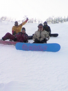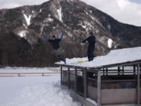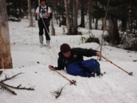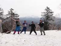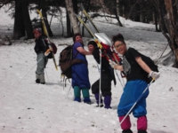 この日一番大変だったのは、鹿児島出身のジョナサン。スキーは全く初めてで、登りはなんとか歩けたものの下りはぜんぜん滑れません。半分以上スキーを持ち、大汗かいて雪の中を走ったおかげで、体重が4kg減ったそうです。よかったねー! ジョナサン。あと2回行ったら標準体型にもどれるよ〜。