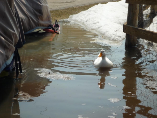 雪解けとともにあちこちに大きな水たまりができ、水鳥たちは待ってましたとばかりに柵を抜け出し、嬉しそうに、お気に入りの場所で水遊び。